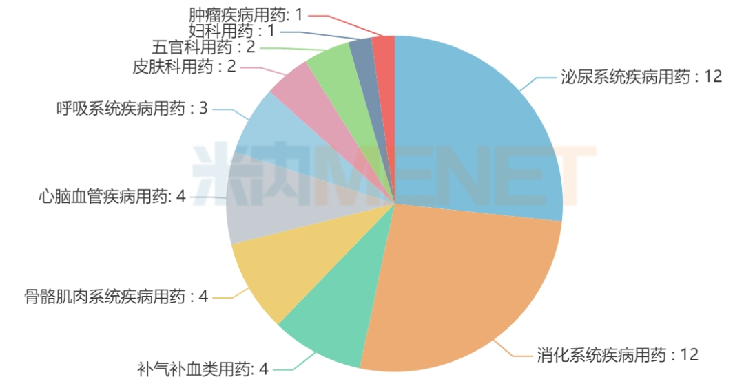 45个中成药涵盖10个治疗大类,其中消化系统疾病用药、泌尿系统疾病用药各有12个。米内网数据显示,2025年一季度中国零售药店终端中成药大类格局中,上述2个大类分别位列第二、第五。